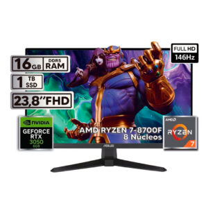 PC de mesa Power Group con procesador AMD Ryzen 7 5700G, 16 GB de memoria RAM DDR4 3200 MHz y almacenamiento SSD M.2 de 1 TB. Incluye monitor ASUS VG249QE5A de 23.8 pulgadas Full HD 146 Hz IPS, teclado y mouse de cable.