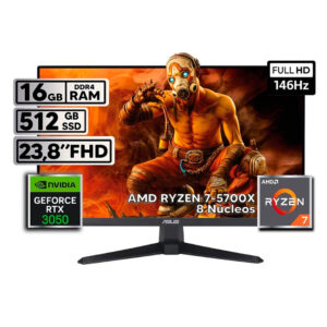 PC de mesa Power Group con AMD Ryzen 7 5700X, 16GB RAM, SSD M.2 de 512GB y tarjeta gráfica RTX 3050 de 6GB. Incluye monitor ASUS 23.8” FHD 146Hz IPS, teclado, mouse y licencia Kaspersky.