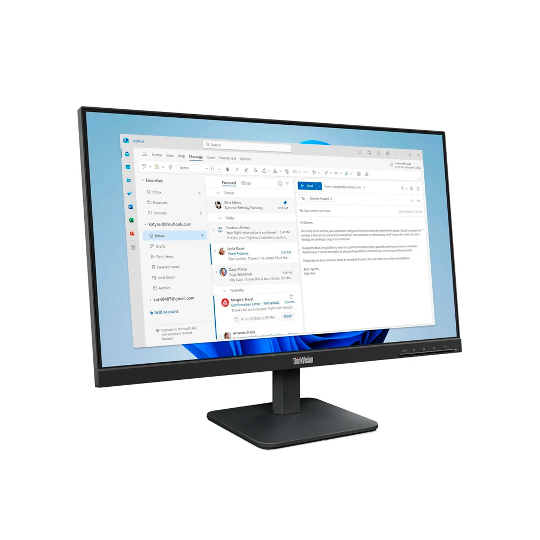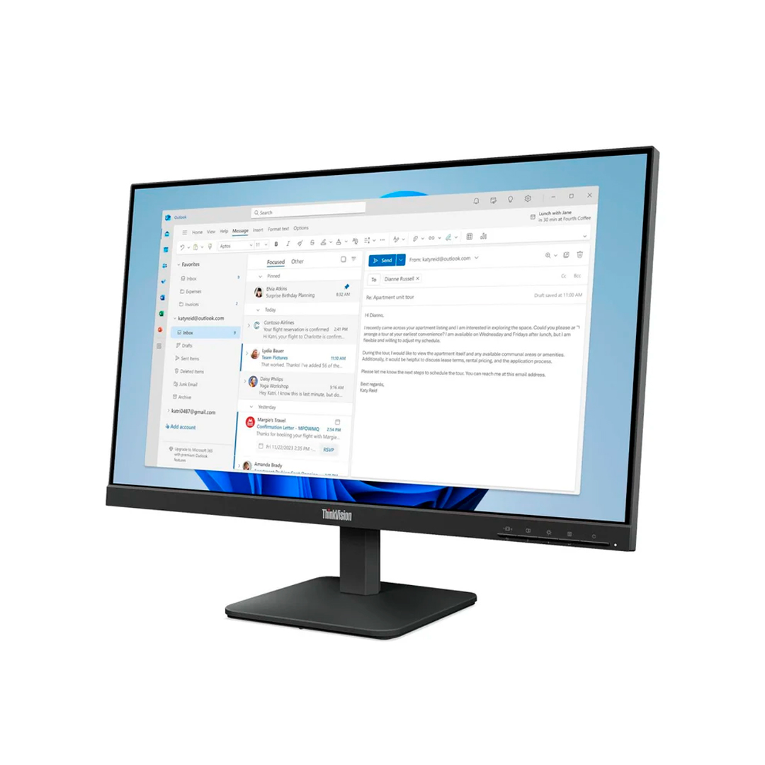 El Monitor Lenovo ThinkVision S24-4E es una pantalla profesional de 23.8 pulgadas Full HD (1920 × 1080) ideal para entornos de oficina, estudio, entretenimiento y tareas diarias. Su panel IPS con amplia cobertura de color ofrece colores precisos y ángulos de visión amplios, mientras que la frecuencia de actualización de 100 Hz brinda desplazamientos más fluidos para contenido dinámico.