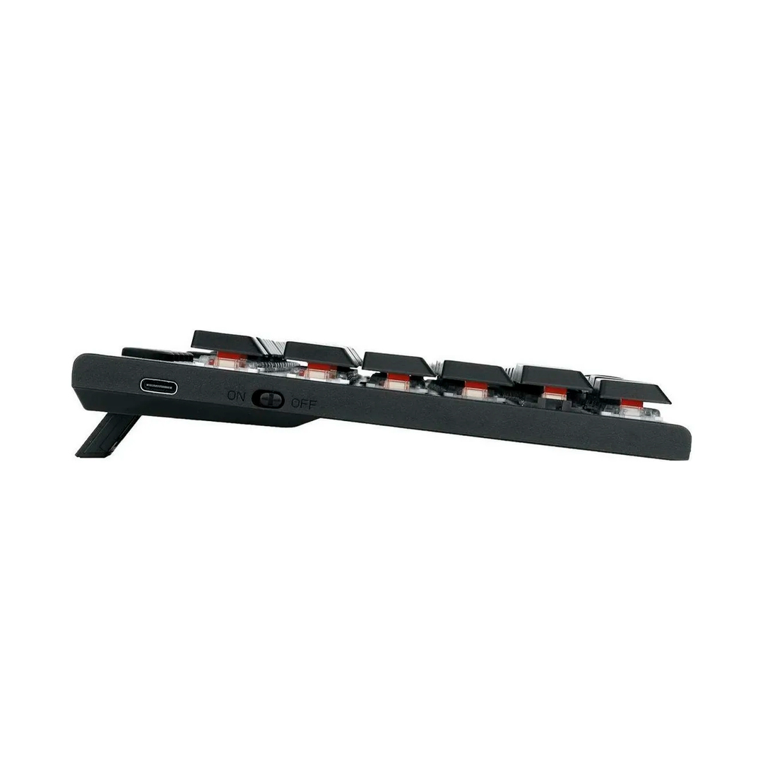 Equipado con interruptores mecánicos Red, este teclado ofrece una pulsación suave y lineal, ideal para juegos y escritura fluida. La iluminación RGB personalizable añade efectos de luz dinámicos que resaltan la estética del equipo y pueden ajustarse según el ambiente o preferencias del usuario.