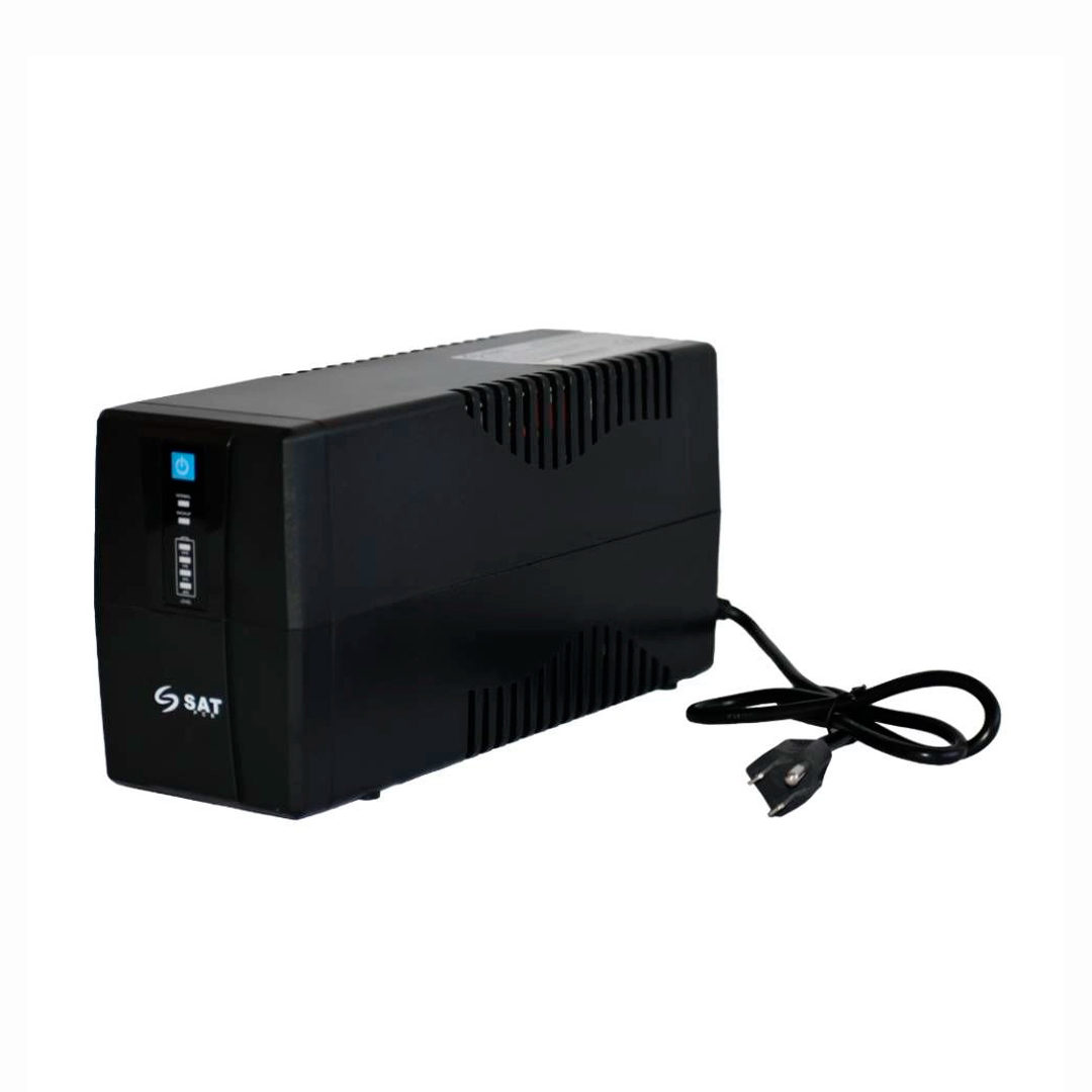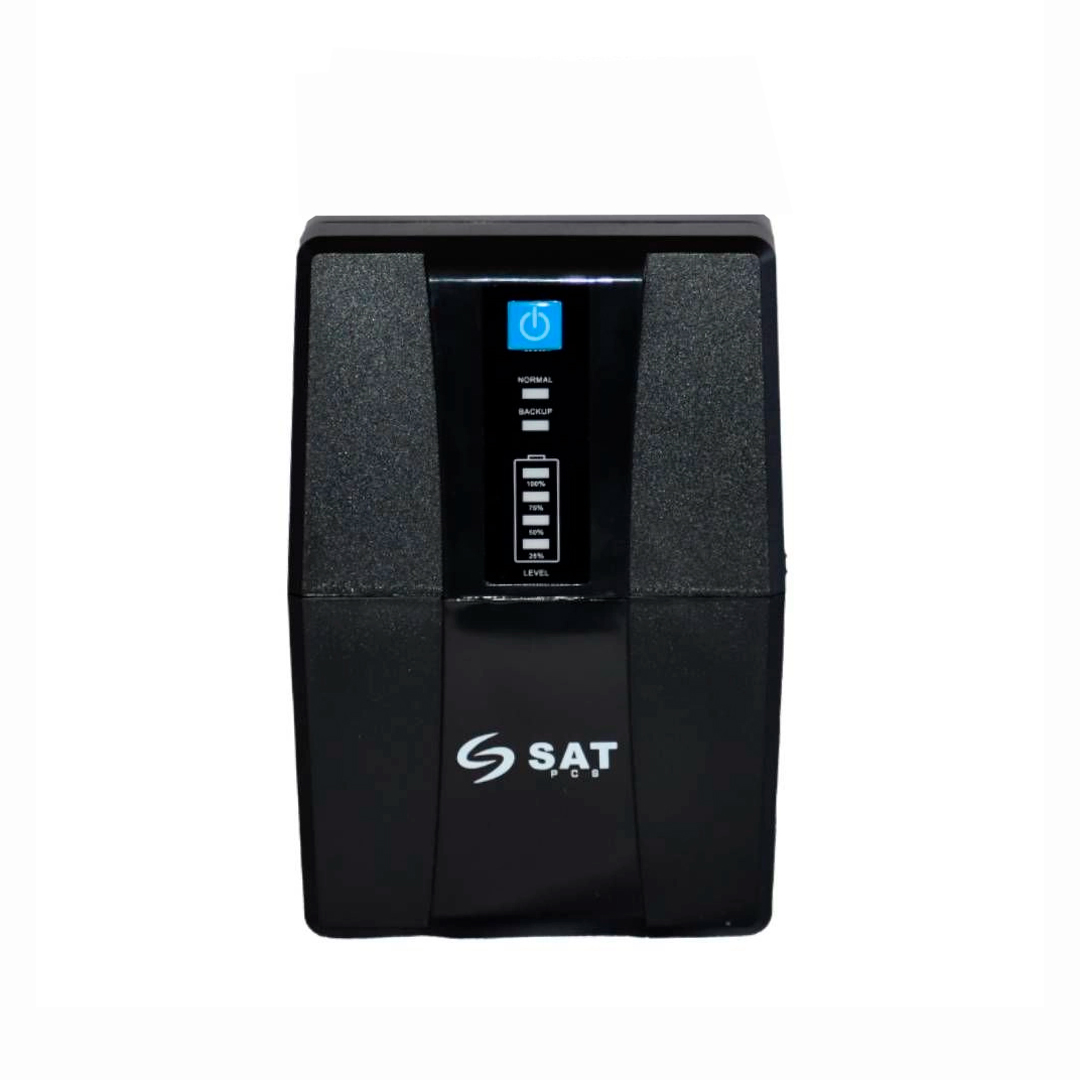 UPS interactiva SAT UR750+ de 750VA y 375W con regulación automática de voltaje y protección contra apagones y fluctuaciones eléctricas. Ideal para computadores y equipos de oficina.