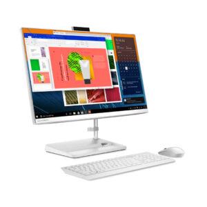 Lenovo AIO 3 24ALC6 con un procesador Ryzen 5 7430U, 8GB RAM y SSD 256GB, pantalla de 24″ FHD y diseño blanco con teclado y mouse incluidos.
