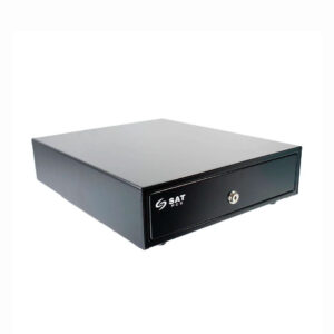 Cajón monedero SAT 119X metálico con conexión RJ11 para POS. Incluye 5 espacios para billetes, 8 para monedas y apertura automática mediante impresora.