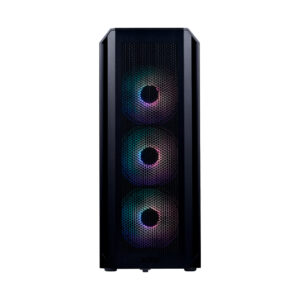 Chasis XPG Defender negro con panel mesh y 3 ventiladores no RGB, ideal para setups de alto rendimiento.