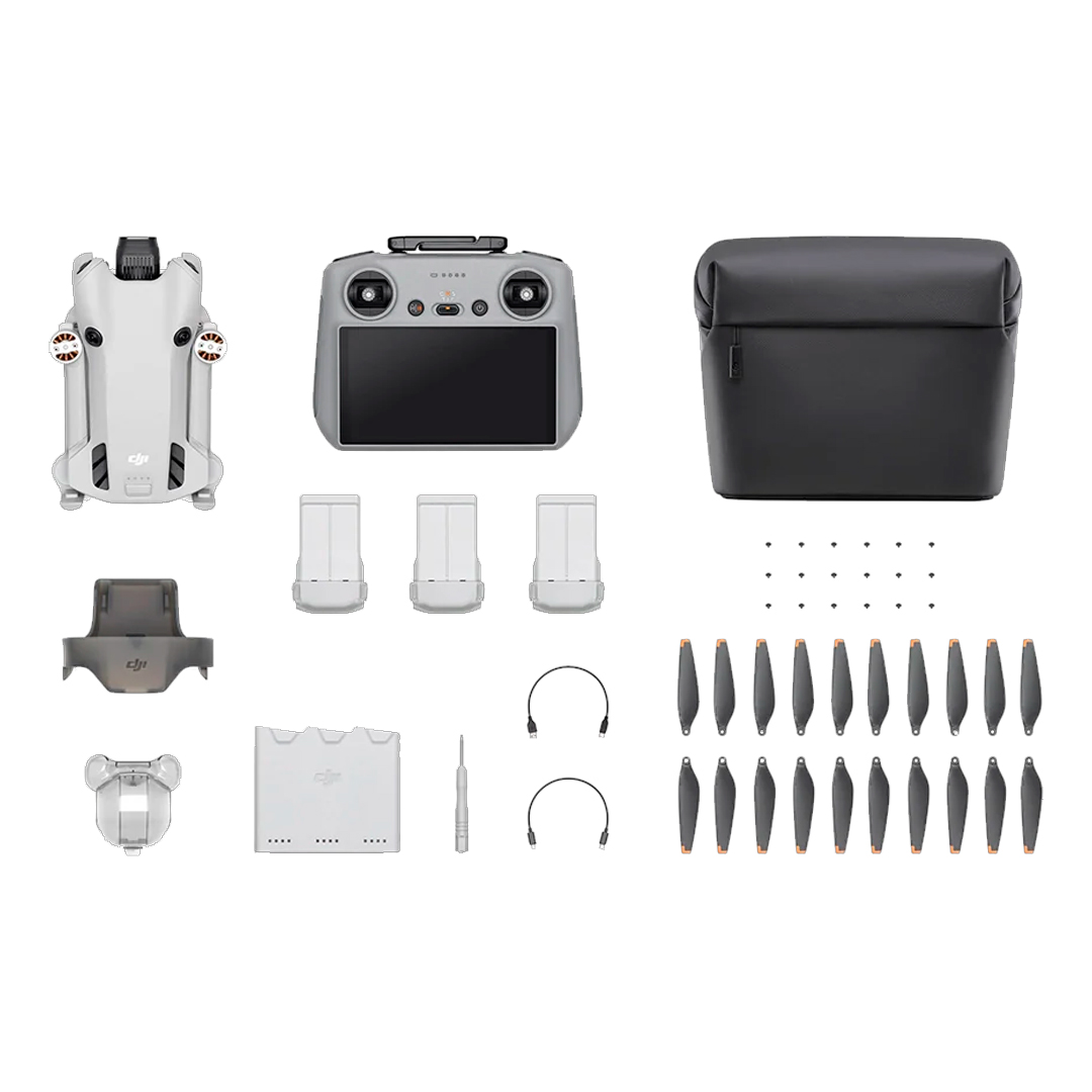Dron DJI Mini 4 Pro Combo Plus RC 2 con control remoto con pantalla integrada, 3 baterías y soporte microSD hasta 512GB.