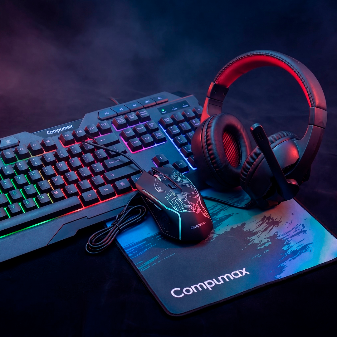 Combo Gaming 4 en 1: Incluye Teclado, Mouse, Diadema y Pad Mouse para un setup completo.
