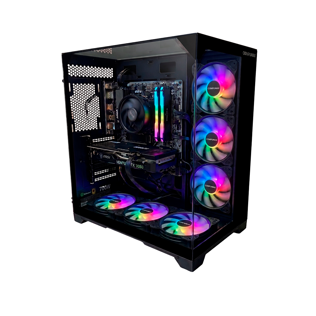 Su chasis Prisma no solo destaca por su diseño moderno, sino que alberga una tarjeta de video MSI Ventus RTX 3050, garantizando gráficos fluidos y realistas con trazado de rayos. Además, el ecosistema se completa con un monitor Compumax de 120Hz y un kit periférico total, asegurando que tengas todas las herramientas para la victoria desde el primer momento.