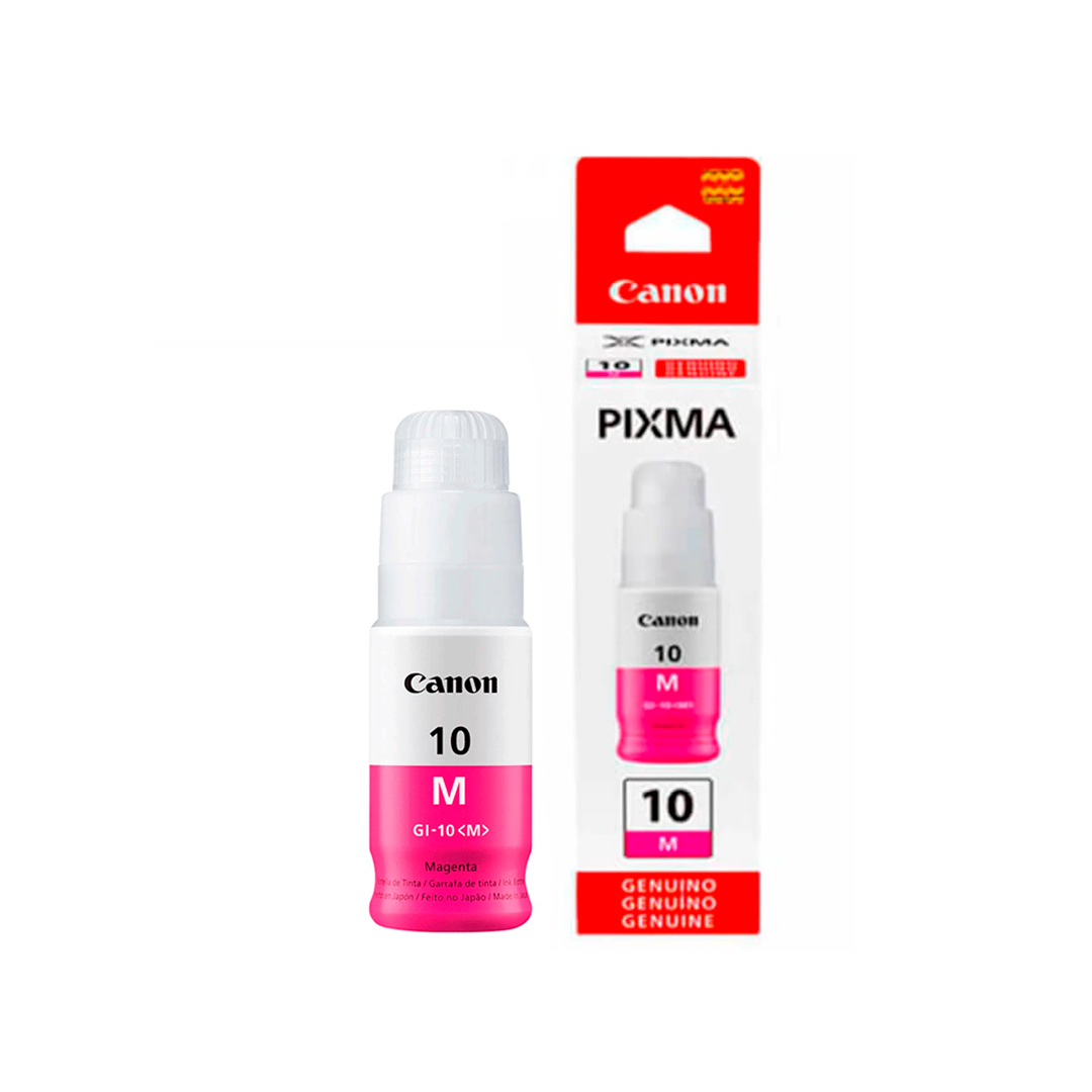 Tinta Canon 10 color magenta en botella original, compatible con impresoras Canon con sistema de tanque de tinta. Ideal para impresión de documentos, textos y gráficos.